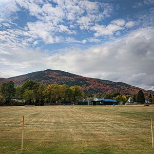 Sunny fall day over the colorful mountain and soccer field in Colebrook, NH.