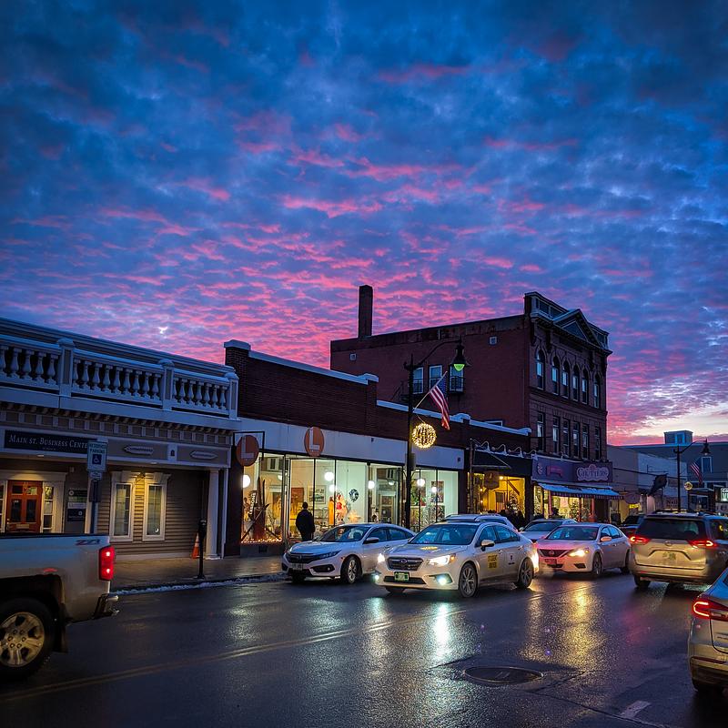 Late sunset and traffic showing the hustle and bustle in Littleton, NH.